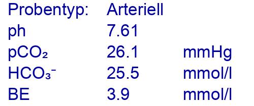 Der Normbereich für den pCO2 liegt zwischen 35 und 45 mmHg, daher: Respiratorische Alkalose. Der Normbereich für den Baseexcess BE liegt zwischen -3 und 3 mmol/l, daher: Metabolische Alkalose. Der Normbereich für den pH liegt zwischen 7.35 und 7.45, daher: (Globale) Alkalose. Die richtige Antwort lautet somit: Kombinierte metabolische und respiratorische Alkalose (die respiratorische Störung überwiegt).