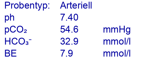 (Hinweis: Der Normbereich für den pH liegt zwischen 7.35 und 7.45. Der Normbereich für den pCO2 liegt zwischen 35 und 45 mmHg. Der Normbereich für den Baseexcess BE liegt zwischen -3 und 3 mmol/l.)