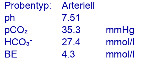(Hinweis: Der Normbereich für den pH liegt zwischen 7.35 und 7.45. Der Normbereich für den pCO2 liegt zwischen 35 und 45 mmHg. Der Normbereich für den Baseexcess BE liegt zwischen -3 und 3 mmol/l.)