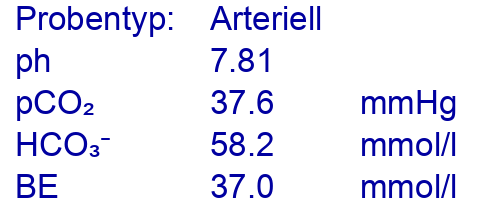 (Hinweis: Der Normbereich für den pH liegt zwischen 7.35 und 7.45. Der Normbereich für den pCO2 liegt zwischen 35 und 45 mmHg. Der Normbereich für den Baseexcess BE liegt zwischen -3 und 3 mmol/l.)