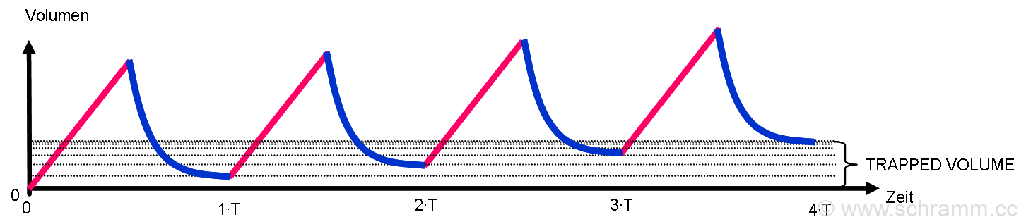 Die Compliance C entspricht in der Physiologie der Anstiegssteilheit der Volumenkurve V=V(p) als Funktion des Druckes p also im Druck-Volumen-Diagramm: C=ΔV/Δp im Limes Δp → 0. Wenn demnach das Airtrapping-Volumen in der Lunge verbleibt resultiert daraus ein Druckanstieg Δp=ΔV/C. Diese Druckerhöhung bezeichnet man als intrinsischen PEEP oder Autopeep.