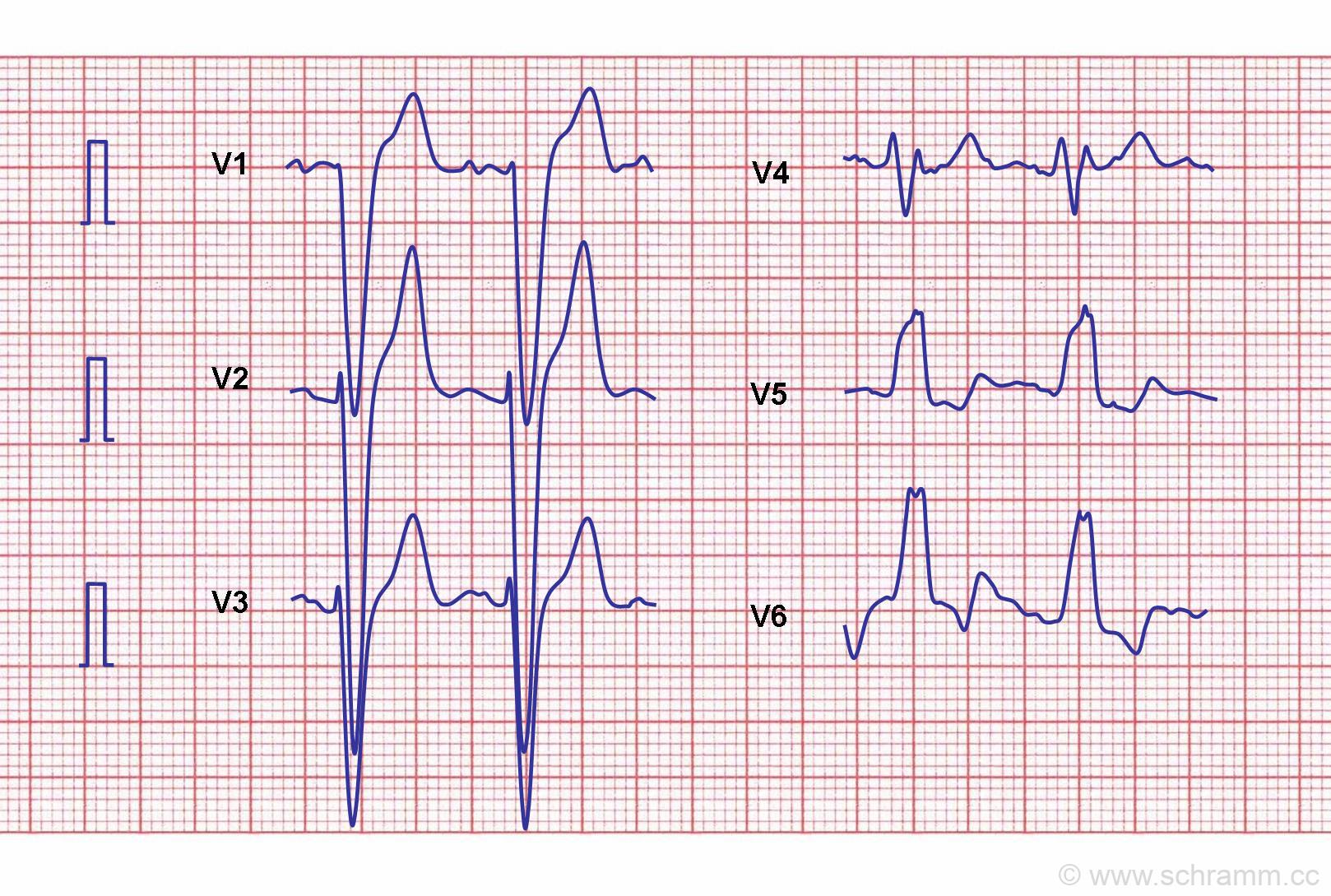 Das EKG zeigt einen typischen kompletten Linksschenkelblock. Beim kompletten Linksschenkelblock ist der gesamte linke Tawara-Schenkel in der Erregungsleitung gestört. Ein Linksschenkelblock beruht meistens auf einer Linksherzhypertrophie. Weitere übliche Ursachen sind eine koronare Herzkrankheit, Myocardinfarkt, Kardiomyopathien (u.U. mit Hypertrophie) und die Myokarditis.
