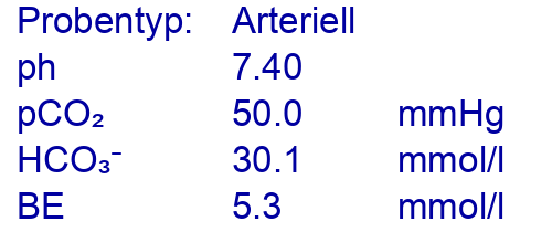 (Hinweis: Der Normbereich für den pH liegt zwischen 7.35 und 7.45. Der Normbereich für den pCO2 liegt zwischen 35 und 45 mmHg. Der Normbereich für den Baseexcess BE liegt zwischen -3 und 3 mmol/l.)