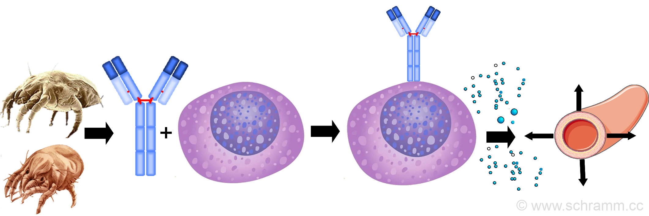 Ein anaphylaktischer Schock ist die Maximalausprägung einer allergischen Reaktion: Beim Erstkontakt wird der Körper zunächst auf das Allergen sensibilisiert, das heißt, das Immunsystem produziert Abwehrzellen und Immunglobuline (IgE). Diese werden bei neuerlichem Kontakt mit dem Allergen aktiviert und heften sich an Mastzellen und basophile Granulozyten, welche daraufhin massenhaft vasodilatierende und permeabilitätssteigernde Mediatoren (Histamin, Prostaglandine, Leukotriene, den Plättchen-aktivierenden Faktor und andere sowie Zytokine) ausschütten. Im Schockgeschehen tritt deshalb auch Flüssigkeit aus den Blutgefäßen aus, wodurch sich Ödeme bilden. Im Kehlkopfbereich sind derartige Schwellungen lebensgefährlich. Durch den Flüssigkeitsmangel bricht die Organversorgung zusammen, es droht ein Herz-Kreislauf-Stillstand. Histamin bewirkt zudem einen Bronchospasmus, der sich bei Betroffenen als akute Dyspnoe manifestiert.