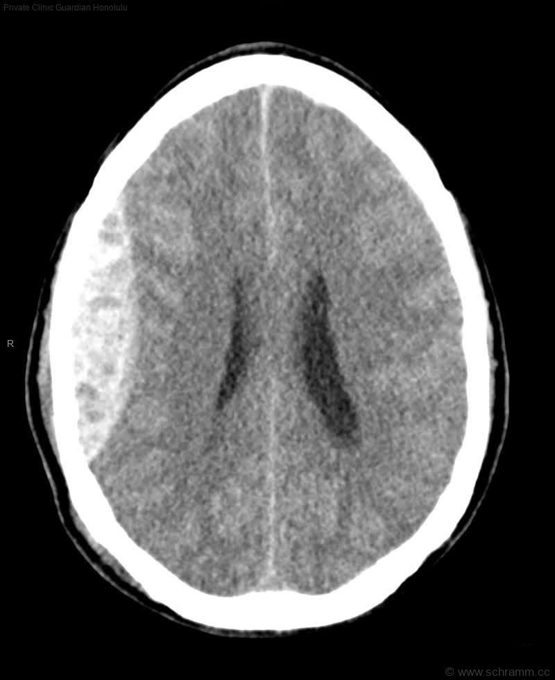 Das epidurale Hämatom entsteht durch eine akute Blutung meist aus der A. meningea media zwischen Schädelknochen und Dura mater. Im diesem CCT zeigt sich eine bikonvexe, hyperdense, scharf begrenzte Raumforderung, als typischer Befund für ein epidurales Hämatom. Eine notfallmäßige neurochirurgische Eröffnung des Schädelknochens (Trepanation) ist i.d.R. bei einem epiduralen Hämatom indiziert.