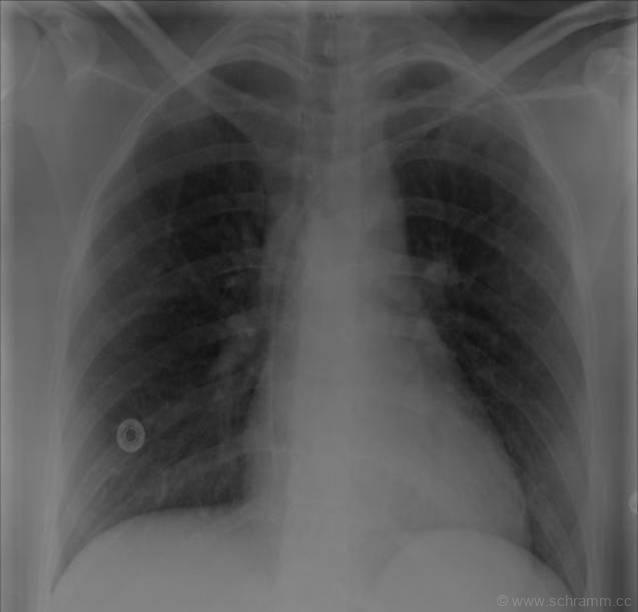 In diesem Thoraxröntgen zeigt sich ein zentraler Venenkatheter, welcher über die