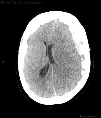 Das subdurale Hämatom zeigt sich charakteristisch als zum Hirngewebe konkav verlaufende intrakranielle Blutung. Es handelt es sich um eine Blutung zwischen Dura mater und Arachnoidea. Pathophysiologisches Korrelat des Subduralhämatoms ist meist ein Riss der Brückenvenen, die die oberflächlichen Hirnvenen zu den Sinus durae matris drainieren. Bei dem akuten subduralen Hämatom kommt es innerhalb von wenigen Stunden zu einer Einblutung in den Subduralraum mit zunehmendem Druck auf das umgebende Gehirn und entsprechender neurologischer Symptomatik. Therapeutisch bleibt hier nur die sofortige Operation.